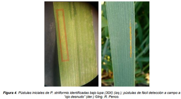 Por otro lado, la RE, lineal o amarilla se caracteriza por ser de naturaleza “sistémica”, es decir que a partir de una uredospora (espora), se forman nuevos uredos (pústulas) en línea y en pocos días se puede cubrir la hoja, a diferencia de la roya de la hoja o anaranjada (Puccinia triticina). Esta última, es de naturaleza localizada, es decir que desarrolla una pústula por espora depositada sobre el tejido vegetal (Figura 2).