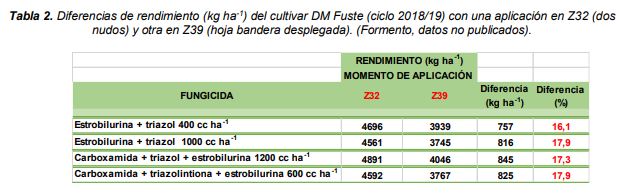 La demora en aplicar un fungicida adecuado en las primeras etapas de encañazón (Z31 o Z32, uno o dos nudos) a HB completamente desplegada (Z39) en un año epifítico, ocasiona daños foliares de magnitud considerable con importantes pérdidas del rendimiento. En el ciclo agrícola 2018/19, sobre el cultivar DM Fuste, susceptible a RE y con detección visible el 03/09/18, se aplicaron fungicidas en Z32 (06/09) con una incidencia de 1,5 % y en Z39 (26/09) con una incidencia de 66%; la reducción del rendimiento por un retraso en la aplicación de 20 días significó una pérdida promedio de 810 kg ha-1 , algo más del 17 % con un rendimiento promedio de las parcelas testigo sin aplicación de fungicidas de 3242 kg ha-1 (Tabla 2).