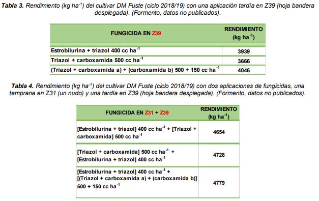 En algunos sistemas productivos con cultivares de alto rendimiento, pero susceptibles a RE y con condiciones climáticas conductivas de la enfermedad, sería posible realizar dos aplicaciones de fungicidas, siempre combinando principios activos con diferente mecanismo de acción para reducir la probabilidad de generar resistencia en el patógeno. Por ejemplo, la comparación de una aplicación tardía en Z39 (Tabla 3) o dos aplicaciones en dos estadios (Z31 + Z39 mostró incrementos del rendimiento entre 15 y 23 % por reducir los efectos negativos de la enfermedad (Tabla 4) (Formento, datos no publicados).