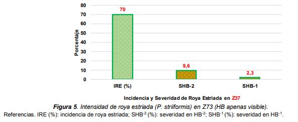 En septiembre de 2016, se detectó en DM Algarrobo y en octubre de ese año, además de este cultivar, en K. León y DM Fuste con severidad alta (40-70 %) y en DM Ceibo, K. Serpiente, K. Lanza, Buck Claraz y Biointa 1008, con severidad moderada (10 y 30 %). Actualmente, es una enfermedad generalizada en todas las regiones trigueras de la Argentina, incluida la provincia de Tucumán con lotes que presentaban 100 % de incidencia y 15 % de severidad, en el mes de julio de 2020. Por el contrario, en ese mismo año en la región pampeana y en Entre Ríos, los factores limitantes del cultivo, fueron las heladas y el déficit hídrico, con casos puntuales de enfermedades foliares severas.