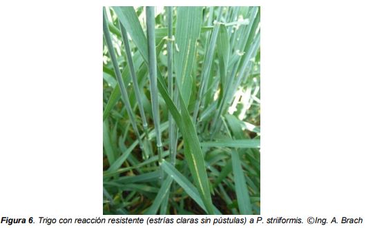 - es posible encontrar hojas de trigo con reacción resistente sin producción de pústulas (uredos) (Figura 6).