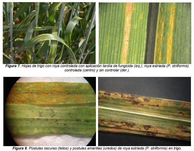 - cuando la aplicación de fungicida se realiza en forma tardía y el hongo ya había colonizado tejidos, en las hojas de trigo se observan áreas rectangulares de tejido seco fisiológicamente inactivo, sin embargo, se detiene la producción de inóculo secundario (Figura 7).
