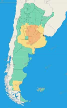 Buenos Aires: Costa de Bahía Blanca – Costa de Coronel Dorrego – Costa de Coronel de Marina Leonardo Rosales – Costa de Villarino – Monte Hermoso – Norte de Bahía Blanca – Oeste de Patagones – Oeste de Villarino – Puan – Zona baja de Coronel Pringles – Zona baja de Coronel Suárez – Zona baja de Saavedra – Zona baja de Tornquist – Adolfo Gonzales Chaves – Centro de Lobería – Norte de Coronel Dorrego – Norte de Necochea – Norte de San Cayetano – Norte de Tres Arroyos – Costa de Lobería – Costa de Necochea – Costa de San Cayetano – Costa de Tres Arroyos – Costa de General Pueyrredón – Costa de Mar Chiquita – General Alvarado – General La Madrid – Laprida – Olavarría – Azul – Rauch – Tapalqué – Zona baja de Benito Juárez – Zona baja de Tandil – Zona serrana de Benito Juárez – Zona serrana de Lobería – Zona serrana de Necochea – Zona serrana de Tandil – Ayacucho – Balcarce – General Guido – Maipú – Noroeste de General Juan Madariaga – Noroeste de Mar Chiquita – Oeste de General Pueyrredón – Oeste de Castelli – Oeste de Chascomús – Oeste de Dolores – Oeste de General Lavalle – Oeste de Lezama – Oeste de Punta Indio – Oeste de Tordillo – Pila – General Alvear – General Belgrano – General Paz – Las Flores – Lobos – Monte – Navarro – Roque Pérez – Saladillo – Brandsen – Cañuelas – Oeste de Magdalena – San Vicente – General Las Heras – General Rodríguez – Luján – Marcos Paz – Mercedes – San Andrés de Giles – Suipacha – Campana – Exaltación de la Cruz – San Antonio de Areco – Zárate – Escobar – San Fernando – San Isidro – Tigre – Vicente López – General San Martín – Hurlingham – Ituzaingó – José C. Paz – Malvinas Argentinas – Moreno – Morón – Pilar – San Miguel – Tres de Febrero – Esteban Echeverría – Ezeiza – La Matanza – Merlo – Brandsen – Cañuelas – Oeste de Magdalena – San Vicente – Berisso – Ensenada – La Plata – Almirante Brown – Avellaneda – Berazategui – Florencio Varela – Lanús – Lomas de Zamora – Presidente Perón – Quilmes