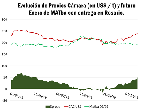 Se expone una gráfica que compara la evolución en los últimos meses de los precios spot y a cosecha, y la diferencia (spread) entre los mismos. Para los primeros se utilizan como referencia los precios pizarra de la Cámara Arbitral de Cereales, convirtiéndose a dólares según el tipo de cambio comprador Banco Nación. En tanto, para el trigo nuevo se utiliza el cierre de MATba, con entrega a enero de 2019 en Rosario. En términos generales, a medida que la fecha de vencimiento de un contrato se hace más cercana, lo usual es que su precio tienda a converger con el precio spot o disponible. Esta situación es la que venía ocurriendo hasta mediados de septiembre, donde se produce un punto de inflexión y los precios retornan hacia el sendero de la divergencia. Esto se debe, por un lado, a la escasez de mercadería con la que se ha arribado al período de empalme entre cosechas, lo que impulsa los precios disponibles al alza y, por otra parte, al aletargamiento de la demanda a cosecha al que se hacía alusión previamente, lo que ejerce presión sobre las cotizaciones futuras. Se puede observar claramente cómo el spread entre ambos precios se acentúa sostenidamente entre mediados de septiembre y mediados de octubre.