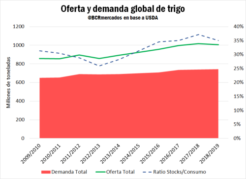 En el ámbito internacional, el stock mundial de trigo cae por primera vez en seis años de acuerdo a las estimaciones del USDA. La demanda mundial proyectada para la campaña 2018/19 es de 746 millones de toneladas que deberán ser abastecidas por una producción de 730 Mt y stocks remanentes de 274 Mt. En consecuencia, el ratio stock/consumo caería a 35,02% luego de haber alcanzado un valor récord para lo que va del siglo XXI de 37,2% la campaña pasada