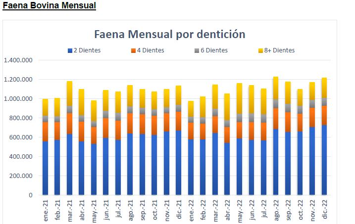 A lo largo del año 2022, se faenaron 13,5 millones de bovinos; un (+4,1%) que los 13,0 millones que se habían faenado entre enero y diciembre de 2021. El mayor aporte al incremento de la faena proviene de las hembras de 8 y más dientes, que superaron en 322,6 mil cabezas la faena acumulada durante el año pasado, también se incrementó la cantidad de novillos de 6 dientes, (+133,7 mil), las vaquillonas de 2 dientes, (+133,8 mil), y los novillitos de 2 dientes, (+120,1 mil). En sentido contrario, las categorías que muestran los mayores recortes en la comparación interanual han sido las vacas de 6 dientes (-116,5 mil), los novillitos de 4 dientes (-95,3 mil), y las vaquillonas de 4 dientes (-69,1 mil).