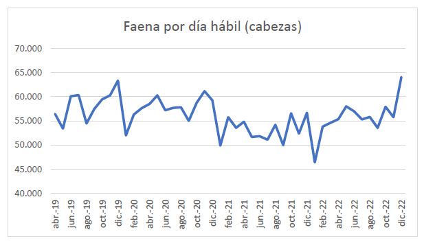 La faena diaria del mes de diciembre del corriente año, se ubicó en 64,1 mil cabezas, un (+14,9%) por encima de las 55,8 mil diarias procesadas en noviembre último, y un (+13,1%) por encima de las 56,7 mil correspondientes a diciembre de 2021.