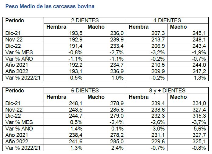 El peso promedio de las carcasas bovinas correspondiente al duodécimo mes del corriente año alcanzó los 227,8 kilogramos, siendo un (-2,1%) inferior a los 232,8 kilogramos del último mes de noviembre; y también resultando un (-1,3%) inferior a los 230,8 kilos de diciembre de 2021. El peso medio de las carcasas durante el año 2022 se ubicó en 232,1 kilogramos; un (+0,9%) por encima de los 230,0 kilogramos del año 2021.