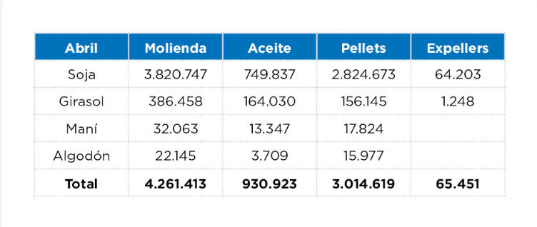De acuerdo a los datos relevados por la Subsecretaría de Mercados Agropecuarios, durante el cuarto mes del año se procesaron 4.261.413 toneladas de granos oleaginosos, volumen que sirvió para producir 930.923 toneladas de aceite, 3.014.619 toneladas de pellets, y 65.451 toneladas de expellers.
