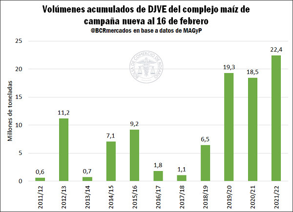 La menor cosecha maicera limitará el desempeño exportador de Argentina en el ciclo comercial 2021/22. En las últimas semanas, las Declaraciones Juradas de Ventas Externas (DJVE) del maíz de la próxima campaña (2021/22) casi no incrementaron su volumen. A pesar de esto, se cuenta con un tonelaje acumulado de 22,4 Mt hasta el 16 de febrero, implicando un récord histórico en términos absolutos y representando el 67% de las estimaciones preliminares de exportaciones para dicho ciclo (33,5 Mt). Vale aclarar que las condiciones climáticas generaron un recorte de consideración sobre el saldo exportable de la próxima cosecha elevando justamente la participación de las DJVE sobre las exportaciones. Al mismo tiempo, deben tenerse en cuenta los cupos y “volúmenes de equilibrio” que se han impuesto para esta próxima campaña desde el Gobierno Nacional. En este sentido, el panorama exportador se ve aún más restringido ya que con las 25 Mt habilitadas hasta el momento para el ciclo 2021/22, sólo quedarían 2,56 Mt para declarar ventas externas.