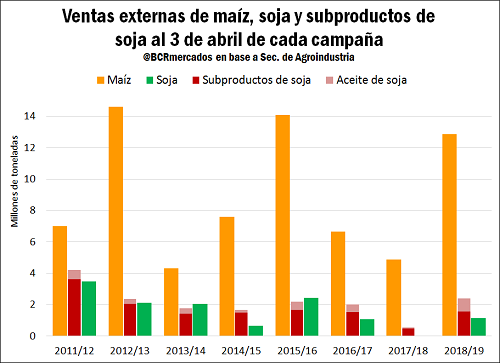 En lo que respecta a las declaraciones juradas de ventas al exterior de maíz al 3 de abril, éstas más que duplican actualmente el volumen registrado la campaña anterior, ascendiendo a 12,8 millones de toneladas. Esta marca es la tercera más alta en 9 años, y se ubica sustancialmente por encima del promedio de las últimas 7 campañas de 8,4 Mt.