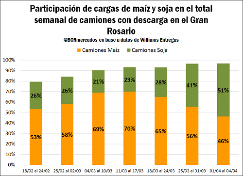 En la medida en que las condiciones ambientales lo permitan, los productores priorizan la cosecha de la soja, para evitar pérdidas pre-cosecha menos probables en las plantas de maíz que resisten mejor el paso de los días y los potenciales excesos de humedad. El avance de la cosecha sojera puede advertirse en un progresivo cambio de patrón en la descarga de mercadería en el Gran Rosario. Tal como ilustra el gráfico debajo, el maíz lideró la carga de camiones que ingresaron al Gran Rosario en las últimas semanas. Sin embargo, se aprecia que la participación del cereal comienza a decrecer a partir de la segunda mitad del mes de marzo, a medida que la soja recupera terreno. Esta semana, los camiones de oleaginosa destronaron a las entradas de maíz en el Gran Rosario, representando el 51% del total. Dada la capacidad de descarga finita de los puertos e industrias ubicados a lo largo del río Paraná, es natural que ante la mayor disponibilidad de soja en el mercado se priorice su entrada a las terminales.