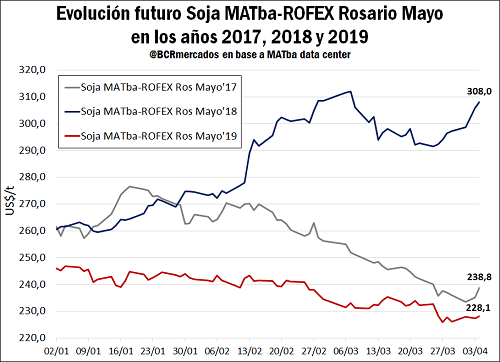 En un contexto internacional atípico y complejo, en el que la disputa arancelaria entre el mayor importador global de soja –China- y uno de los dos principales exportadores de la oleaginosa -Estados Unidos- condiciona la evolución de los valores de referencia para la soja en el mercado de Chicago, se observa un impacto bajista sobre los precios a cosecha en nuestro país. De hecho, el precio del futuro de Soja Mayo Rosario listado en MATba-ROFEX es el más bajó de las últimas 3 campañas, ajustando el jueves 4 de abril en US$ 228,1/t. Este valor se ubica US$ 79,9/t por debajo del precio del futuro un año atrás y US$ 10,7/t del futuro mayo en 2017. A pesar de este panorama de precios, muchos productores se ven en la necesidad de vender la soja a cosecha, aunque el porcentaje de negocios con precio a fijar se mantiene en niveles notablemente altos. Con el 23% de la producción 2018/19 negociada, el 72% de los contratos fue hecho bajo la modalidad de fijar precio en una fecha futura. Este porcentaje es un 8% superior al promedio de las últimas 5 campañas. En otras palabras, de las 12,2 Mt de soja 2018/19 negociadas, sólo 3,4 Mt tiene un precio firme.