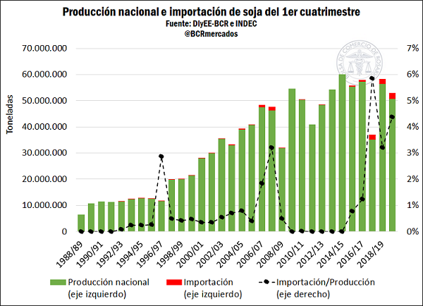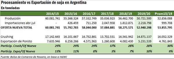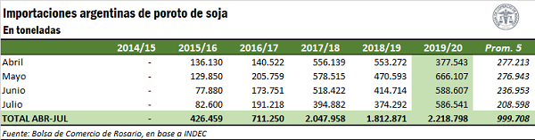 El otro gran componente de la oferta nueva son las importaciones, que para los cuatro primeros meses del año comercial registran un récord histórico de 2,2 millones de toneladas. Como es sabido, Argentina suele recurrir a las provisiones de soja mayormente de Paraguay, pero también Bolivia, Uruguay, Brasil, y en algunos casos excepcionales, Estados Unidos. Si bien no se espera que las importaciones de poroto de soja se mantengan a niveles máximos para el total de la campaña, sí han mostrado una notable suba en el período mayo-julio, con tres meses consecutivos de récords para el mes.