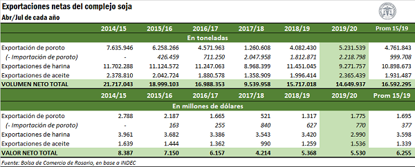 En relación a las exportaciones de poroto son procesar, con el millón cuarenta de despachos del mes de julio, los embarques del primer cuatrimestre de la campaña suman 5,23 millones de toneladas, el volumen más alto desde el ciclo 2015/16 de acuerdo a las cifras del INDEC. Si tomamos las exportaciones netas (exportaciones menos importaciones de poroto de soja), el primer cuatrimestre de la campaña está superando los 3 millones de toneladas, un crecimiento del 33% respecto del año anterior. En valor, las exportaciones de poroto de soja, en tanto, aumentaron un 35% interanual a US$ 1.775 millones entre abril y julio de 2020, aunque las importaciones de poroto crecieron a su vez un 23% a US$ 770,4 millones.