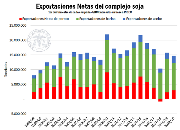 De este modo, el valor de las exportaciones netas de poroto y aceite de soja lograron compensar el menor ingreso de divisas por exportación de harina, con lo que las exportaciones netas de las principales partidas del complejo facilitaron un ingreso de divisas de US$ 5.530 millones en el primer cuatrimestre de la campaña 2019/20, casi sin cambios respecto a los US$ 5.368 de ventas al exterior en el mismo período del año anterior, aunque se mantiene por debajo del promedio de los últimos cinco años.