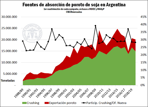 Del lado de la demanda, las dos principales fuentes de absorción para la oleaginosa son la exportación de poroto sin procesar y la industria aceitera, que adquiere el grano para la producción de harina, aceite y otros derivados, sea para volcar al mercado interno o, mayormente, al mercado exterior.
