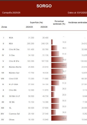 El sorgo granífero continúa consolidando su avance en la campaña 2025/26. De acuerdo con el último informe, la siembra cubre 45,4% de las 900.000 hectáreas previstas, luego de registrar un progreso interquincenal de 11,4 puntos porcentuales. Este ritmo ubica a la campaña con un adelanto interanual de 4,3 puntos, explicado por dos factores clave: la excelente disponibilidad hídrica y una menor intención de siembra, que facilita la cobertura anticipada de los lotes.