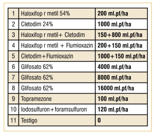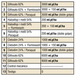 Para ambos experimentos los herbicidas empleados correspondieron a las siguientes denominaciones comerciales: Haloxifop r metil 54%: Galant HL; Cletodim 24%: Select; Flumioxazin: Sumisoya; Glifosato 62%: Sulfosato; Topramezone: Convey; Iodosulfuron + Foramsulfuron (premezcla): Equip; Paraquat: Gramoxone.