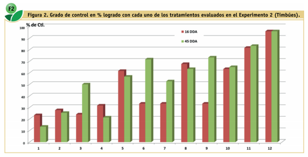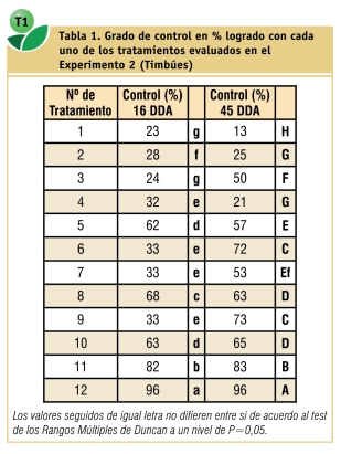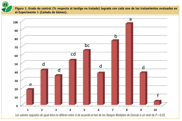 La aplicación se realizó el 03 de enero de 2018 con un ambiente favorable. Se empleó una mochila de presión constante por fuente de CO2 , dotada de 4 boquillas con pastillas Teejet 8001 que erogaban un caudal de 120 l/ha a una presión de 2 bares. El diseño experimental fue en bloques completos aleatorizados con 3 repeticiones. El grado de control se evaluó visualmente en % respecto al testigo sin tratar a los 30 días luego de la aplicación. Los resultados se sometieron al análisis de la variancia previa transformación a arco seno de la raíz cuadrada del valor.