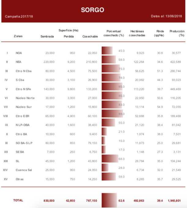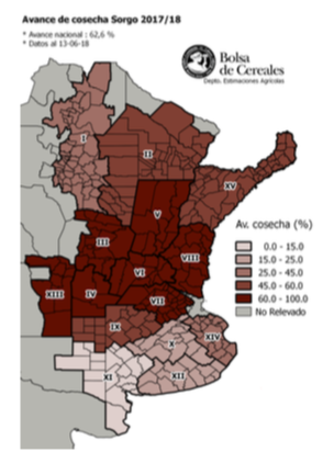 Durante los últimos quince días la cosecha de cuadros de sorgo se dio a buen ritmo en gran parte del área agrícola nacional. Las buenas condiciones del tiempo registradas durante las últimas semanas y la baja en los niveles de humedad de los granos, permiten que las labores comiencen a tomar fluidez. Los rendimientos se mantienen algo por debajo de los promedios de las últimas campañas, particularmente en los cuadros tardíos sembrados en el centro del país. Los mayores avances de cosecha se registran en la zona del NEA y la provincia de Córdoba. Con un avance a nivel nacional de 62,6 %, y luego de cosecharse casi 500.000 Ha, el rinde promedio nacional se ubica en 39,4 qq/Ha. Los mejores rendimientos se ubican en las zonas PAS Núcleo Norte y Sur con promedios por sobre los 50 qq/Ha.
