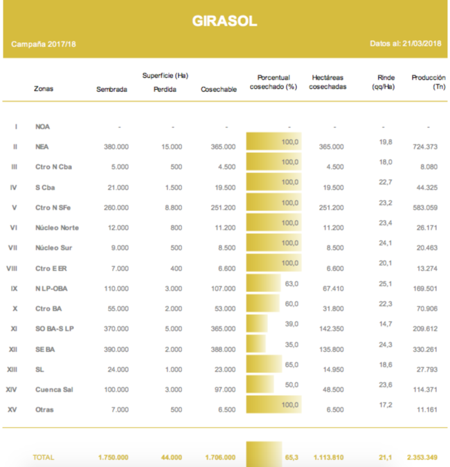 En paralelo, en el Norte de La Pampa-Oeste de Buenos Aires la cosecha de girasol habría alcanzado el 63 % de la superficie apta con rendimientos que oscilaron entre los 19 qq/Ha y 32 qq/Ha. En el centro de Buenos Aires, el volumen parcial acumulado superó las 70.000 toneladas y se relevaron rendimientos que se ubican levemente por encima del promedio de la campaña 2016/17.