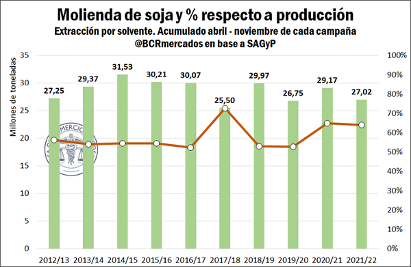 En octubre, la campaña actual iba un 10% por debajo de la campaña 2020/21 en términos de procesamiento industrial acumulado, y un 6,4% abajo del promedio de los últimos cinco años. Sin embargo, con los datos de procesamiento del mejor noviembre desde el año 2016 las brechas se recortaron al 7,3% y al 4,5% respectivamente.