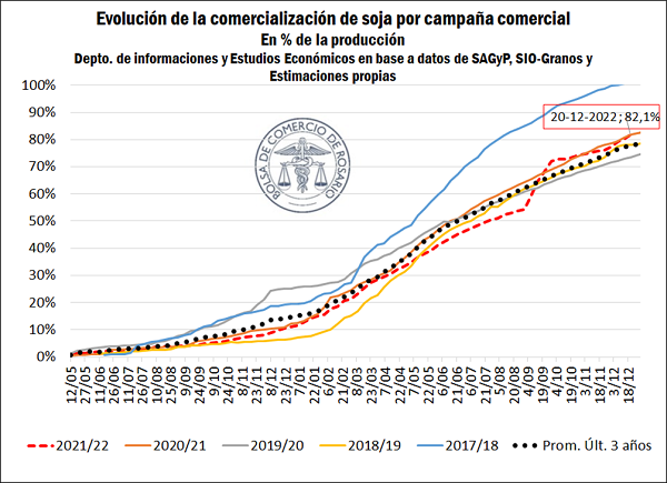 De esta forma, las perspectivas industriales y los dos Programas de Incremento Exportador han incentivado fuertemente la comercialización que ya supera el ritmo de avance relativo de muchas campañas anteriores. Al 20 de diciembre, sólo las campañas 2017/18 y 2014/15 superan el nivel relativo de comercialización de este año en la última década. En términos de volumen, a esa fecha la campaña actual totaliza más de 34,6 Mt comercializadas.