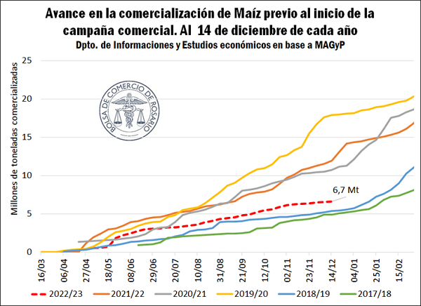 A contramano de ello, el panorama de comercialización del maíz de la campaña venidera se mantiene con cautela por la falta de agua. Al 14 de diciembre se han comercializado internamente casi 6,7 Mt del cereal cuya nueva campaña comienza formalmente en marzo del 2023, cuando el año pasado se estaba llegando a las 12 Mt para esta altura del año.