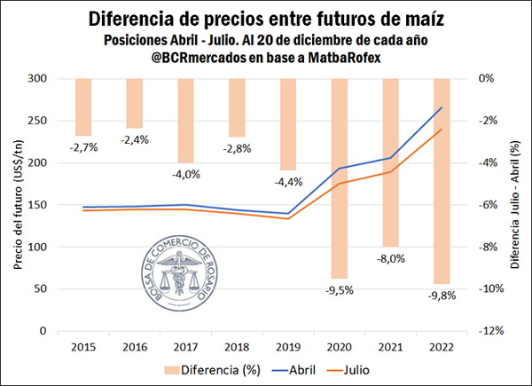 Bajo este contexto, se espera una reconfiguración de la logística maicera de cara a la campaña 2022/23. El grueso del maíz comercializado se perfila a ingresar en junio/julio a los puertos y no en marzo o abril, siendo esta época del año cuando suele cosecharse el maíz tardío. Por ello, el pase de maíz Abril – Julio en Matba-Rofex se ubica por encima de años anteriores. Tal como se observa en el siguiente gráfico, la diferencia porcentual entre las dos posiciones al 20 de diciembre es la más elevada desde al menos 2015, con un spread entre posiciones cercano al 10%