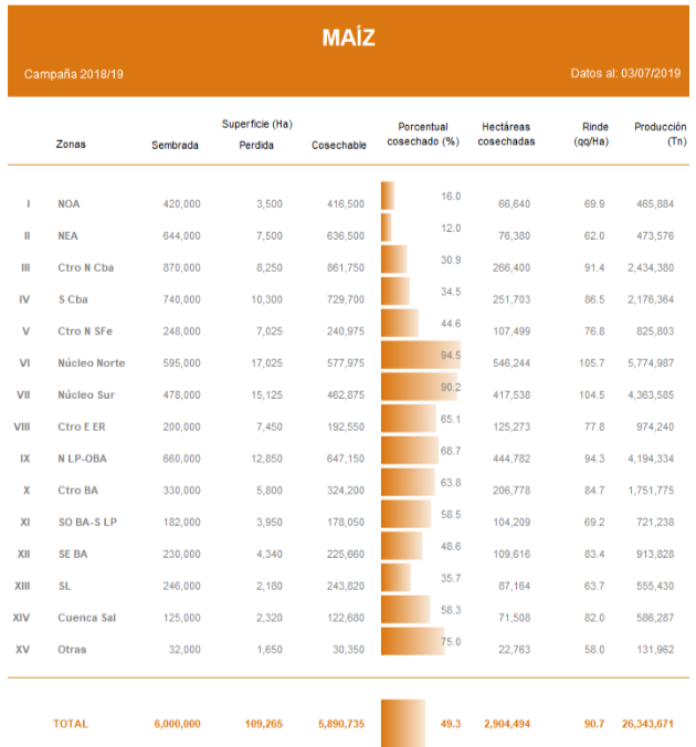 Las productividades relevadas en las provincias de Córdoba y Santa Fe superan las expectativas iniciales, particularmente en los cuadros tardíos del cereal. Por otro lado, la región del NEA presenta demoras en las labores producto de la falta de piso en los cuadros más tendidos. En la zona del NOA el avance de cosecha ya se encuentra en el 16 %, registrando un rinde medio cercano a los 70 qq/Ha. Diferente es la situación sobre las provincias de Chaco y Santiago de Estero, donde la elevada humedad de los granos mantiene las demoras en las tareas de recolección. Sobre las zonas Oeste de Buenos Aires-Norte de La Pampa, Cuenca del Salado y el Centro de Buenos Aires, las primeras heladas intensas del año promueven el descenso en los niveles de humedad de los granos.