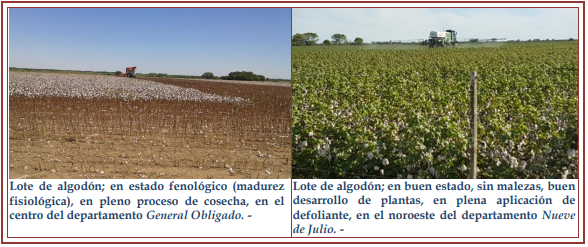 Conjuntamente se concretaron aplicaciones de reguladores de crecimiento y defoliantes. Recomendación a los productores: que procedan a la destrucción de los rastrojos a medida que finalicen la cosecha. Se observaron los siguientes estados fenológicos: R “estados reproductivos” en un muy bajo porcentaje en R2 (1º flor blanca-plena floración) y el resto en desarrollo de cápsulas M “maduración”, M1 (1º cápsula abierta) y los más avanzados, en M2 (60 % de cápsula abierta), madurez fisiológica.