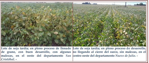 Dada las etapas fenológicas de los cultivares y lo avanzado del ciclo, los indicadores enunciados en los distintos informes anteriores, como desarrollo foliar limitado, estructura de plantas medias a bajas, surcos no cerrados, lotes manchonados, poco uniformes y mortandad de plantas, no cambiaron y con ello la amplitud de los estados perduró. Continuaron las aplicaciones de herbicidas e insecticidas, en muy bajo porcentaje y en lotes que justificaron una acción de control.