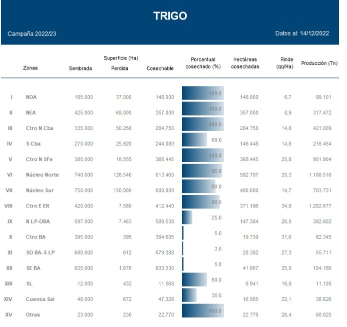 Al mismo tiempo, sobre ambos núcleos y el Sur de Córdoba, donde podría finalizar la recolección de cuadros durante los próximos 7 días, la falta de humedad y las reiteradas heladas durante el periodo de definición de rendimientos determinaron mermas de entre un 40 y un 60 % con respecto al rendimiento medio de las ultimas 5 campañas, siendo el Núcleo Sur una de las zonas más afectadas durante la campaña 2022/23.