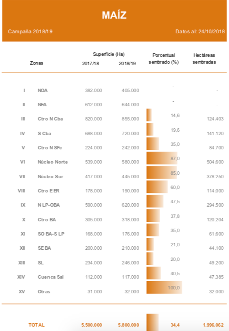Frente a este panorama mantenemos la proyección de siembra de maíz con destino grano comercial para la campaña 2018/19 en 5.800.000 Ha. Esta superficie representa en números absolutos 300.000 hectáreas más que las sembradas la campaña previa (Campaña 2017/18: 5.500.000 Ha). En paralelo, los lotes incorporados a principios de la ventana de siembra, se encuentran en buenas condiciones mientras se realizan las refertilizaciones nitrogenadas.