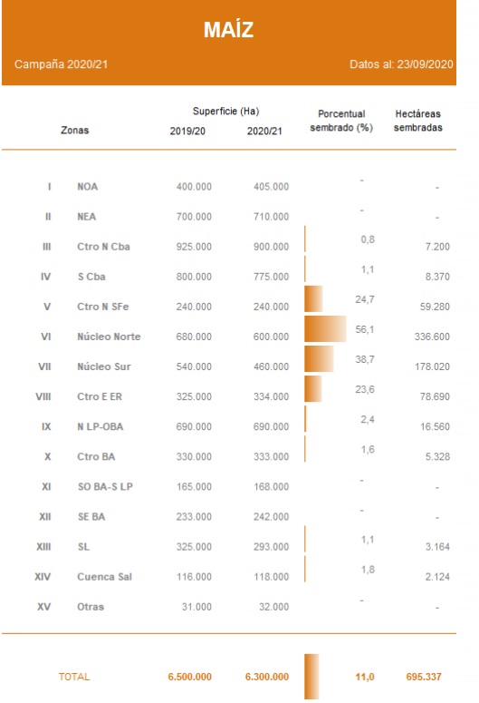 Luego de realizar el relevamiento del área destinada al cereal durante la campaña previa a través del estudio de imágenes satelitales, se vio modificada la superficie finalmente destinada a maíz con destino grano comercial durante el ciclo 2019/20. Este cambio tiene impacto en la actual proyección de área que, sumado a un inicio de ventana de siembra temprana con reservas hídricas irregulares, ubicaría la superficie para la campaña 2020/21 en 6.300.000 Ha. Esta superficie representa en números absolutos 200.000 Ha menos que las implantadas el ciclo previo (Campaña 2019/20: 6,5 MHa).