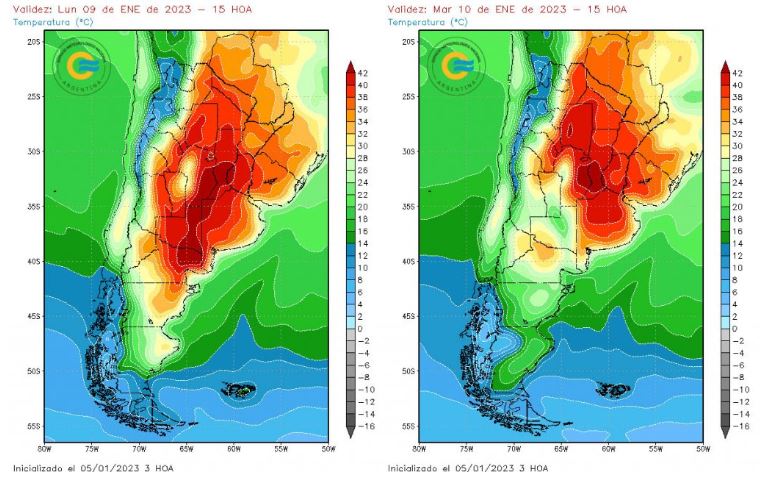 El este del NOA, la mayor parte de Cuyo, el norte de la Mesopotamia, el sudoeste de la Llanura Chaqueña, la mayor parte de la Región Pampeana y gran parte del Uruguay tendrán temperaturas máximas superiores a 30°C, con varios focos con registros mayores a 35 °C y otros con valores inferiores.