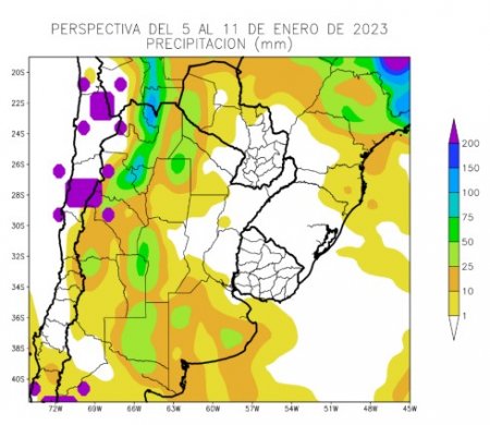 Y, como contrapartida, el centro y este del Paraguay, el noreste y gran parte del centro-este del área agrícola argentina y el Uruguay tendrán precipitaciones escasas a nulas, menores a 10 mm, mientras que la Cordillera Sur experimentará precipitaciones escasas.