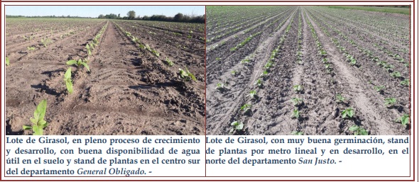 El productor contaba con los materiales e insumos, reservados o comprados, solo la variable climática fue reguladora del inicio del proceso y regularía su desarrollo total. Ante los escenarios ambientales y características climáticas, la siembra y el desarrollo vegetativo continuarían sin inconvenientes, con un mayor ritmo que el de la semana pasada. La intención de siembra total sería superior en un 10 a un 11% el área sembrada la campaña anterior, que fue de 184.500 ha. Lo implantado en primera instancia logró muy buena germinación, emergencia y stand de plantas, no presentando inconvenientes hasta la fecha. Se observaron los siguientes estados fenológicos: V “estados vegetativos”, Ve (emergencia), V1 (1º hoja desarrollada) y lotes puntuales más avanzados V2 (2º hoja desarrollada).
