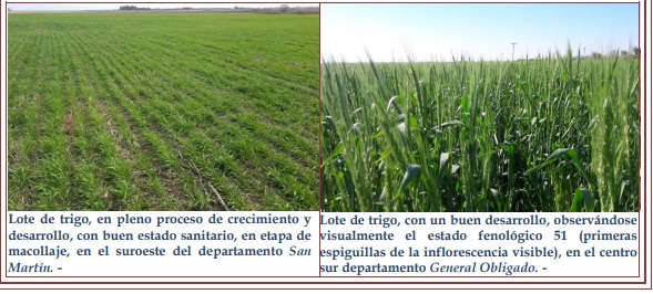 Las condiciones ambientales registradas hasta la fecha, bajas temperaturas, heladas en etapas fenológicas óptimas, precipitaciones de montos variables y de bajas intensidades; y en sanidad, con tratamientos con fungicidas oportunos, como consecuencia de los continuos monitoreos y seguimientos, hicieron que, del total de la superficie sembrada, un 92 % del cultivo se encontró en estado bueno a muy bueno, con lotes excelentes, un 5 % en estado bueno a levemente regular y un 3 % en estado regular. Dicha situación fue generando los distintos escenarios, los cuales augurarían un muy buen desarrollo, sin inconvenientes en la futura etapa de floración y formación de grano del cultivo. Con distintos grados de expectativas, por parte del sector productivo, en el logro de una similar o mayor producción que la campaña anterior, que fue de 1.134.380 tn. Se observaron, los siguientes estados fenológicos: 2 “macollaje” 21 (un tallo principal y un macollo), 23 (un tallo principal y tres macollos), 25 (un tallo principal y cinco macollos), 27 (un tallo principal y siete macollos), 3 “elongación del tallo” 31 (primer nudo detectable), 32 (segundo nudo detectable), 33 (tercer nudo detectable) 37 (hoja bandera visible) 39 (lígula de hoja bandera visible), 4 “preemergencia floral” 41 (vaina de la hoja bandera extendida), 45 (inflorescencia en mitad de la vaina de la hoja bandera), 49 (primeras aristas visibles) y en lotes más avanzados en 5 “emergencia de la inflorescencia” y puntuales en 51 (primeras espiguillas de la inflorescencia visibles).