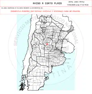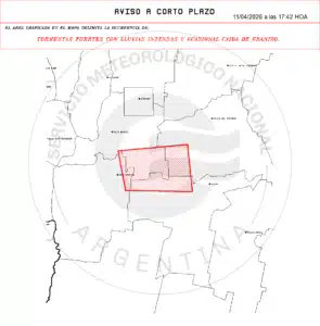 El Servicio Meteorológico emitió un aviso meteorológico a corto plazo por tormentas fuertes con lluvias intensas, actividad eléctrica y ocasional caída de granizo para sectores del centro de Córdoba.