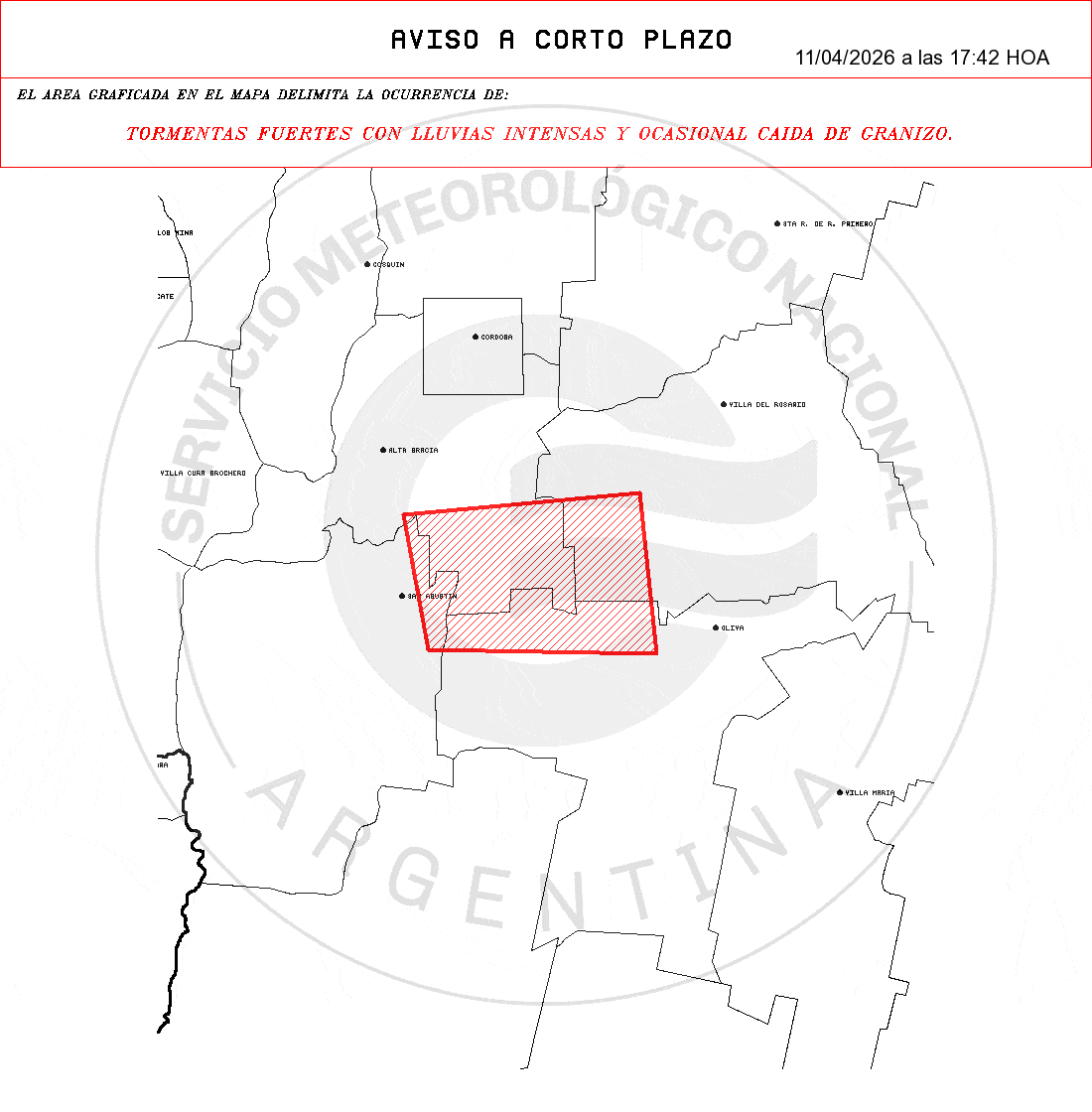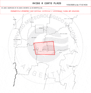 El Servicio Meteorológico emitió un aviso meteorológico a corto plazo por tormentas fuertes con lluvias intensas, actividad eléctrica y ocasional caída de granizo para sectores del centro de Córdoba.