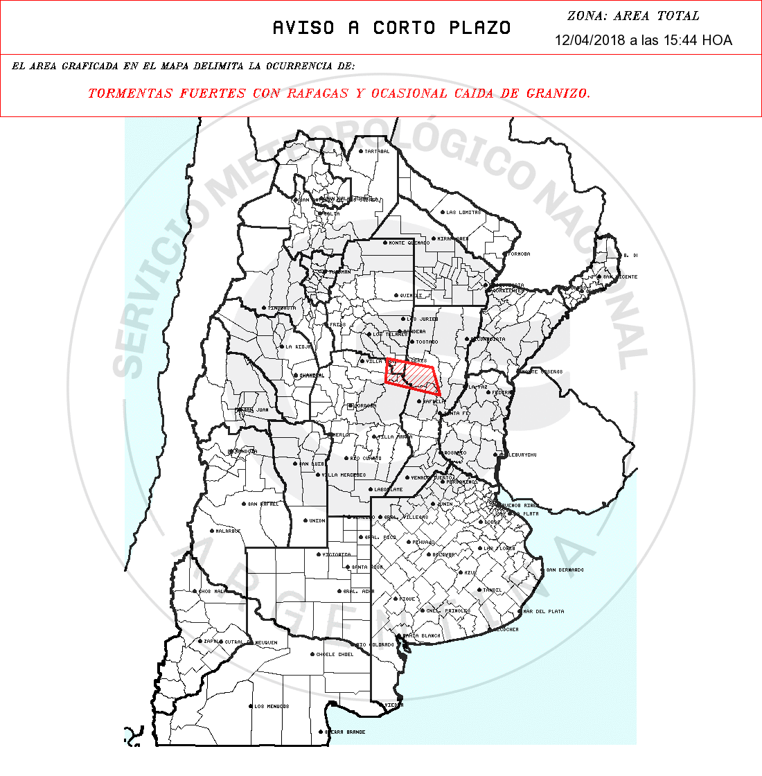 POR OCURRENCIA DE:  TORMENTAS FUERTES CON RAFAGAS Y OCASIONAL CAIDA DE GRANIZO.