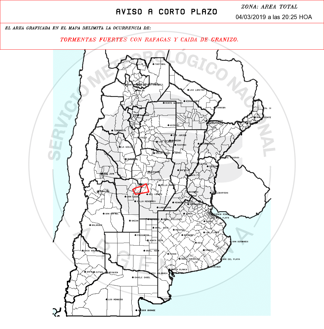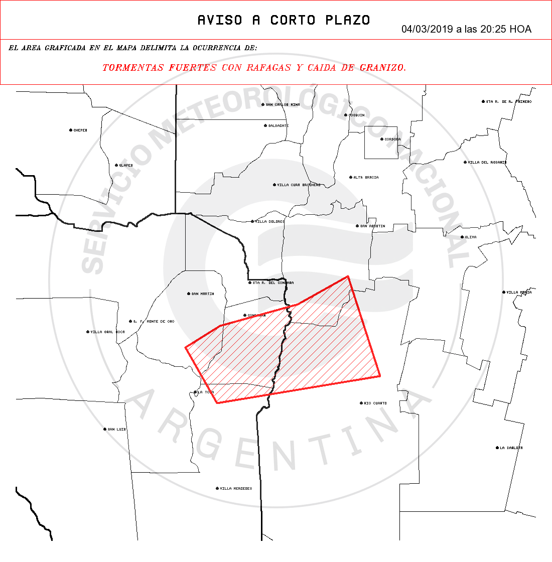 POR OCURRENCIA DE: TORMENTAS FUERTES CON RAFAGAS Y CAIDA DE GRANIZO.