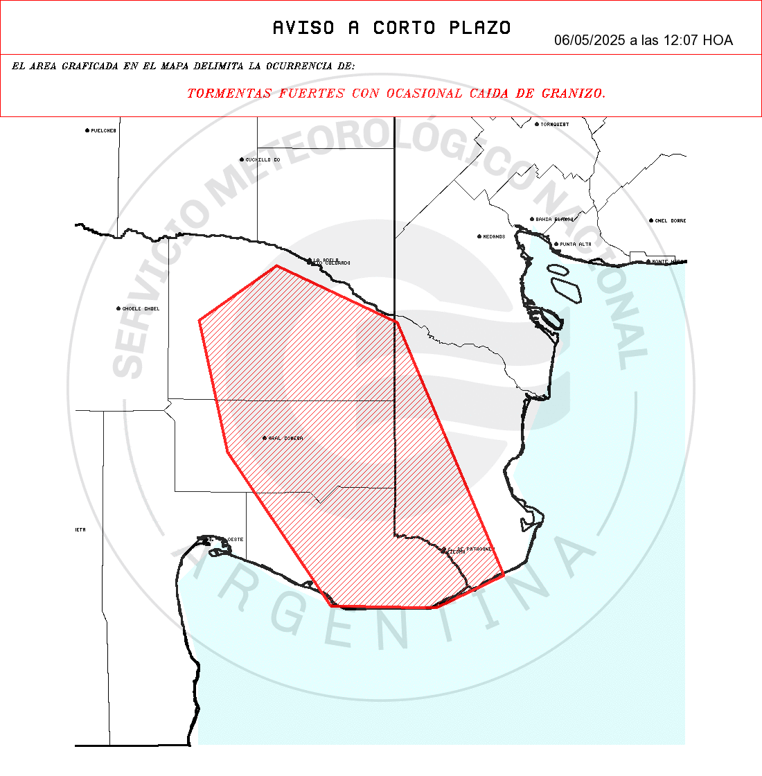El Servicio Meteorológico Nacional emitió un aviso por tormentas fuertes que podrían estar acompañadas de caída ocasional de granizo. El fenómeno afectaría áreas puntuales del sur de la provincia de Buenos Aires, particularmente el partido de Patagones, y sectores de Río Negro, incluyendo los departamentos de Adolfo Alsina, Conesa y Pichi Mahuida.