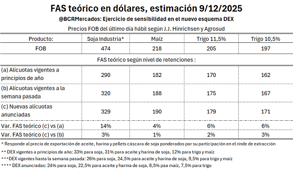 Con precios actuales, el FAS teórico del complejo soja sube 3% respecto de la semana previa al anuncio. Pero la diferencia es mucho más marcada en la comparación interanual: a comienzos de 2025 la soja tributaba 33%, por lo que, de haberse mantenido esa tasa, el FAS sería hoy de US$ 286/t. Con el nuevo nivel de DEX, asciende a US$ 326/t, un 14% más.