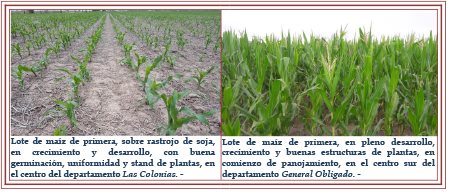 El cultivo de maíz presentó para esta campaña hasta la fecha, un avance en la siembra del 47,3 %, representando unas 89.000 ha. Las mismas correspondieron a lotes sembrados en primera instancia, denominado maíz de primera, el cual de acuerdo al área de estudio tendría dos usos, un porcentaje a grano para futura venta comercial y el otro porcentaje como forraje, para consumo animal bovino.