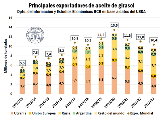 En relación con el comercio internacional del aceite de girasol, las exportaciones mundiales se proyectaron en 10,4 Mt para el ciclo 2022/23, un 5% por debajo de la campaña previa. A su vez, es el valor más bajo en, al menos, los últimos 5 años. Hay que remontarse a la campaña 2017/18 para encontrar un volumen inferior.