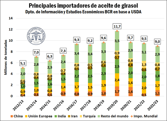 Una figura clave en el consumo de aceite de girasol es la Unión Europea, que pasó de importar 2 Mt en el ciclo previo, a 1,7 Mt en la campaña actual, de la mano de las bajas productivas de la región. China acompaña la tendencia de crecimiento y se espera que duplique sus importaciones de aceite de girasol totalizando 1,1 Mt, frente a las 0,5 Mt referentes a la campaña anterior. También se estima un crecimiento del consumo en 0,1 Mt en Irán. Por último, se espera que Turquía y la India disminuyan las importaciones de aceite en 0,5 Mt cada una respecto a la campaña previa.