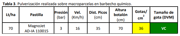 Desde ese momento, durante los diferentes ciclos agrícolas, se pulveriza utilizando este tipo de pastillas sin correr riesgos de fitotoxicidad sobre los cultivos de trigo u otros cercanos sensibles al herbicida glifosato. (Tabla 3).